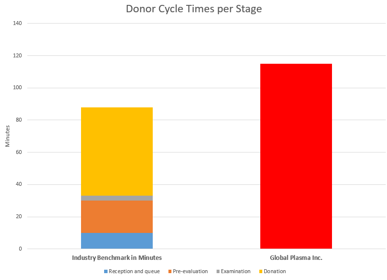 Data collected showed an average Donor Cycle Time (DCT) of 115 minutes, exceeding the industry benchmark of 88 minutes. Key delay points included pre-check, donor evaluation, and bed preparation times.